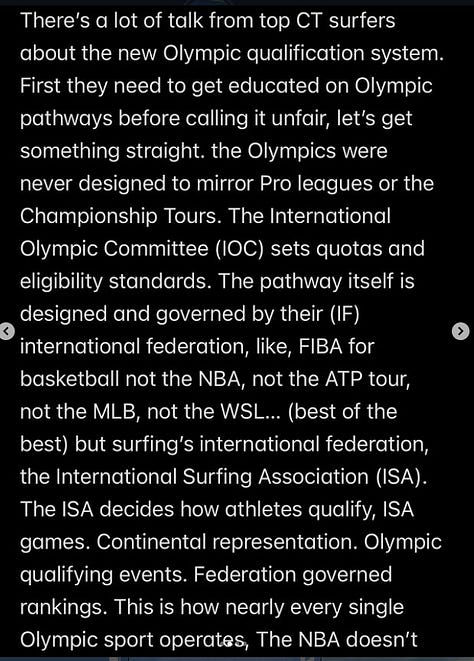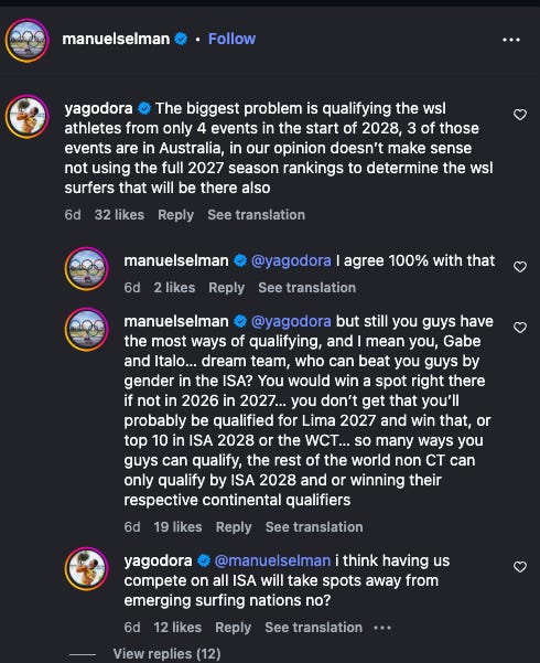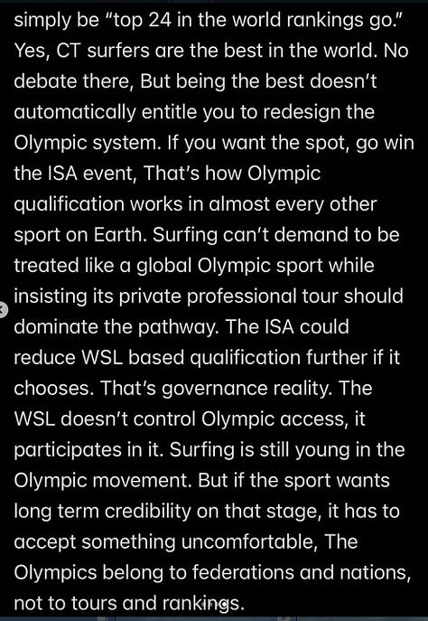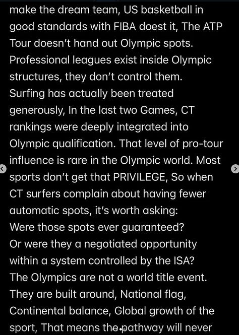 Vejo pouca vontade de ambas as entidades em se unirem e fazerem um calendário favorável, a WSL fica parada 6 meses do ano e a ISA não conseguiu criar um evento pra ter esses atletas competindo em algum lugar bacana é inacreditável!