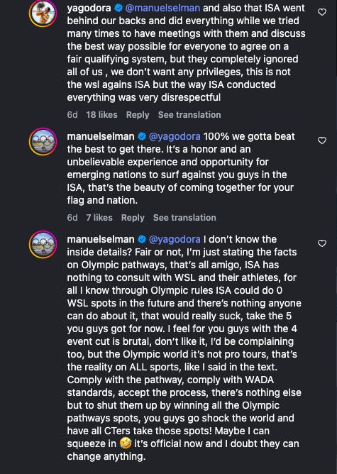 Fala galera, po essa relação ISA X WSL pra quem vê de fora e não sabe profundamente como as coisas funcionam claramente, o que mais me incomoda é ver como o presidente da ISA que ja esta no cargo há muiiiitoooo tempo, parece mto uma briga de egos do que algo que vem a favorecer o desenvolvimento da modalidade. Eu acho que essa treta ISA ( sem grana, mas com as olimpíadas na mão), WSL ($$$$$$$) eu ainda acho que os grandes nomes estarão do lado da grana, afinal surf e olimpíadas ainda é algo extremamente recente, não tem mto apelo no meio olímpico ainda